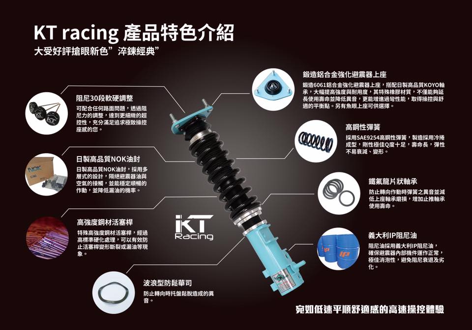 | 敘述 | KT 避震器特色 1. 阻尼30段軟硬調整,可配合任何路面狀況,透過阻尼力的調整,達到更細緻的操控性能,充分滿足追求極致操控感的您 2. 阻尼油採用義大利IP阻尼油,確保避震器內部機件運作正常,極佳消泡性,避免阻尼衰退及劣化 3. 日製高品質NOK油封,採用多層式的設計,隔絕避震器阻尼油與空氣的接觸,能穩定順暢的作動並降低漏油的機率 4. 採用SAE9254高鋼性彈簧,製造採用冷捲成型,剛性極佳Q度十足,壽命長,彈性不易衰減、變形 5. 特殊高強度鋼材活塞桿,經過高標準硬化處理,可以有效防止活塞桿變形、斷裂或漏油等現象 6. 鍛造6061鋁合金強化避震器上座,搭配日製高品質KOYO軸承,大幅提高強度與耐用度,其特殊橡膠材質,不僅能夠延長使用壽命並降低異音,更能增進過彎性能,取得操控與舒適的平衡點。另有魚眼上座可供選擇 |